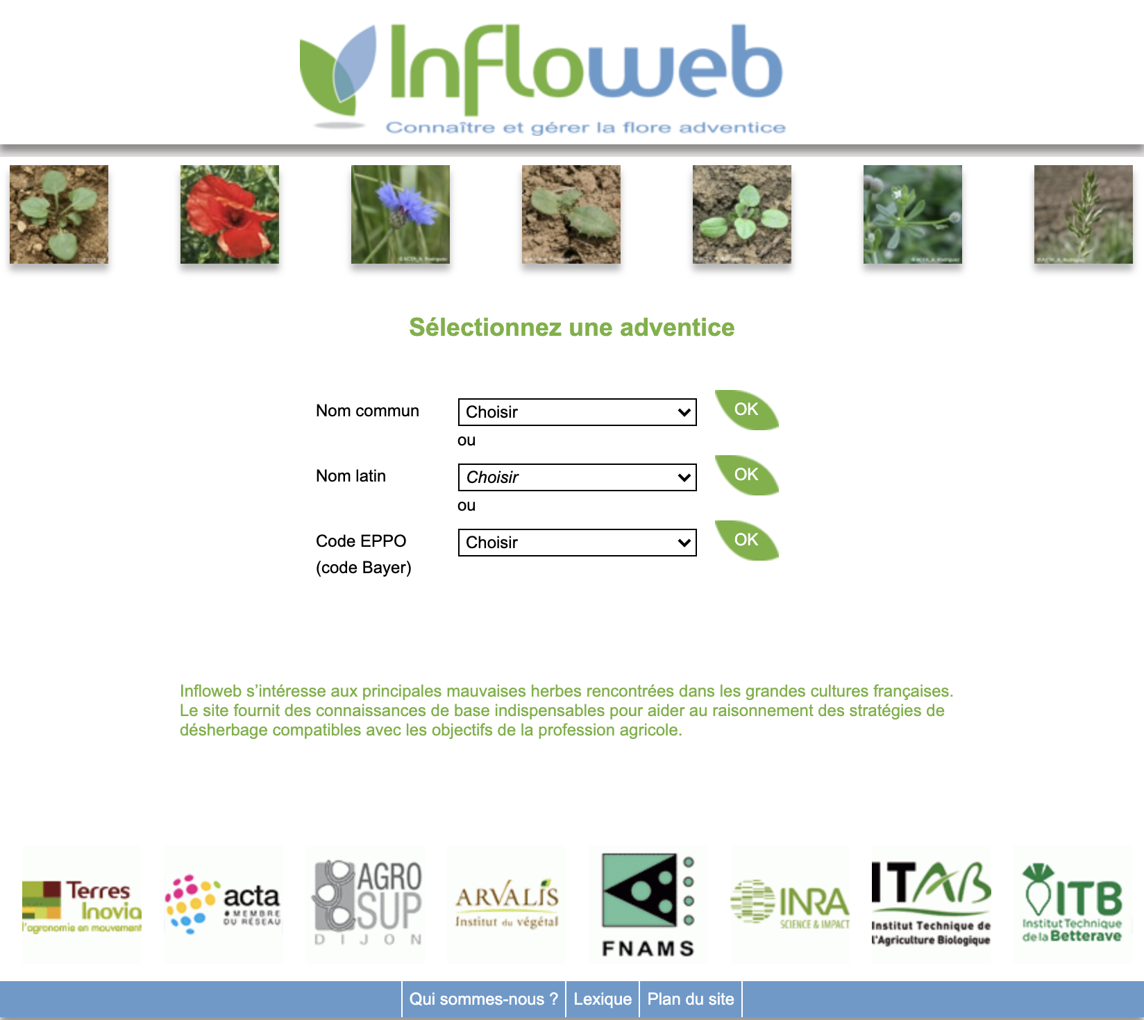 Infloweb is a tool that helps to identify and manage weeds in agriculture. It gathers key technical and scientifical information on 40 weed species commonly found in arable crop fields in France.